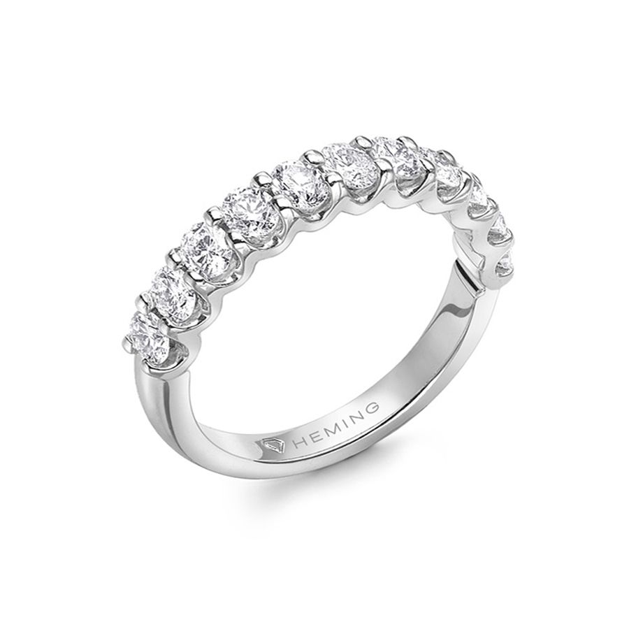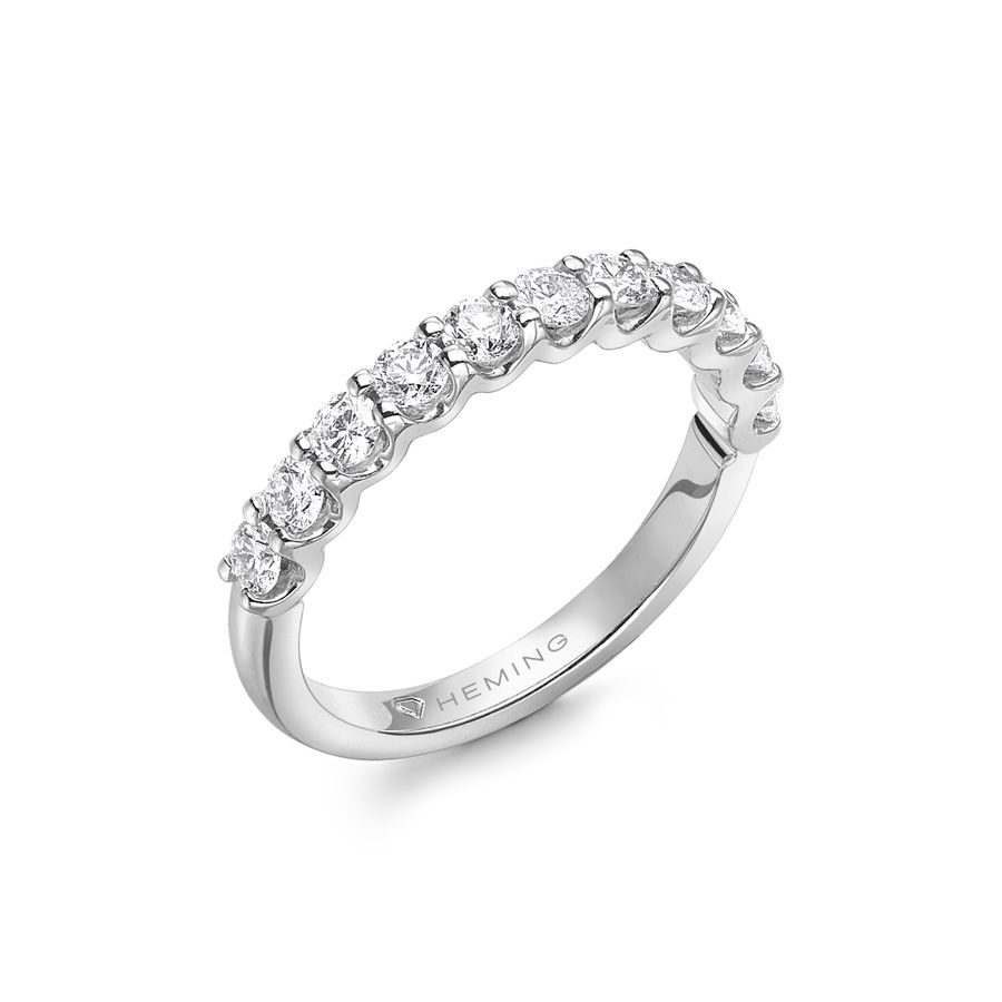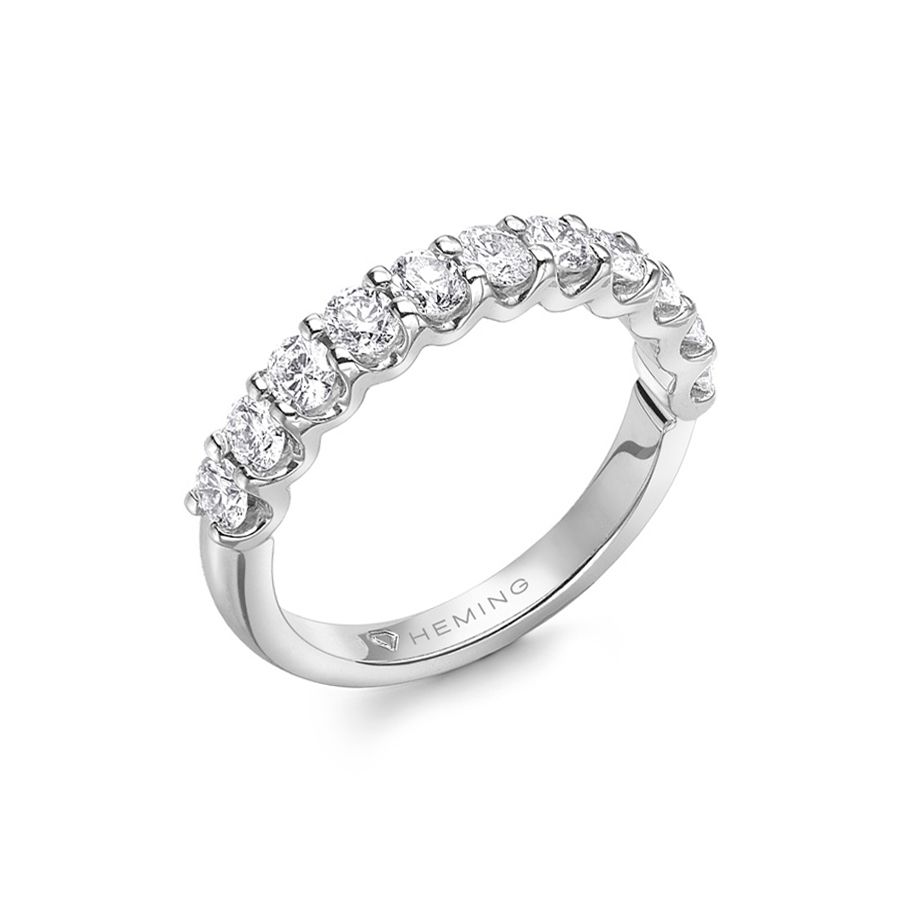 Heming's Canterbury design is a more contemporary style half eternity ring, the scalloped gallery holding round brilliant cut diamonds in shared claw settings, combined weight 0.35-0.85ct dependent on finger size and bandwidth. Manufactured and hand finished in our London workshops, the contoured interior ensures lasting comfort and wearability. Available in widths of 2mm, 2.5mm or 3mm and your choice of precious metal. Full eternity versions of the Canterbury style, set with diamonds all around the finger, are also popular and available upon request.