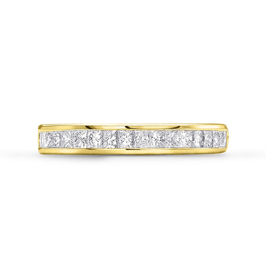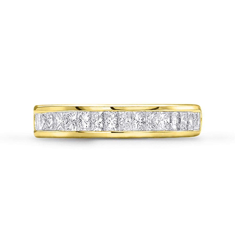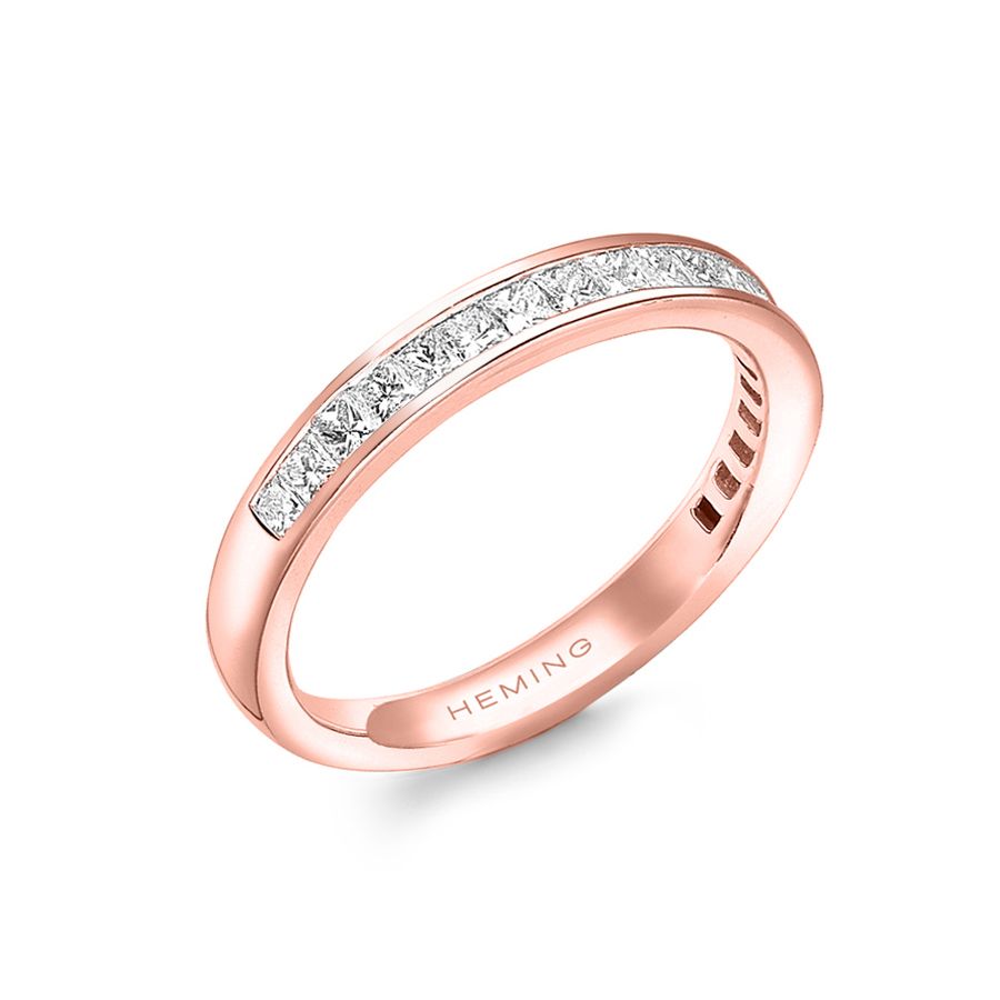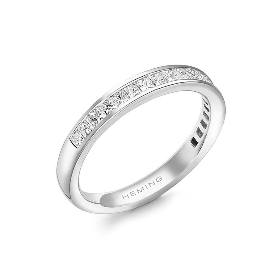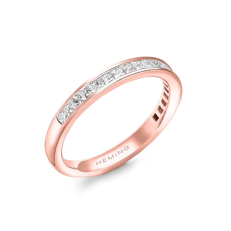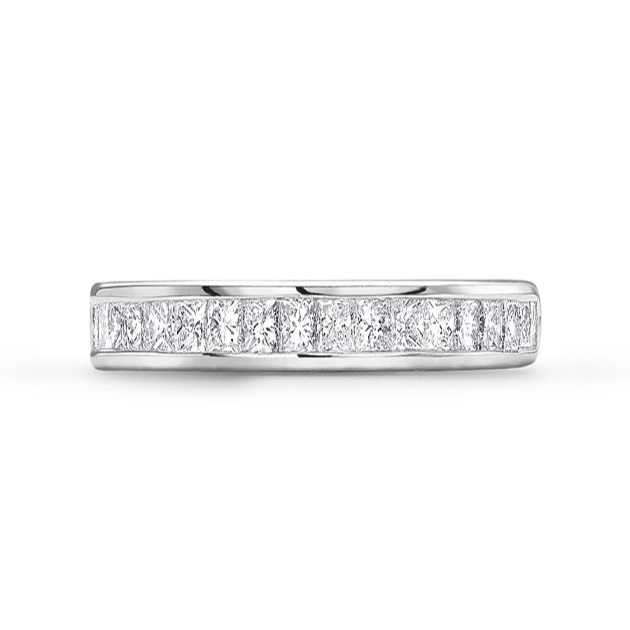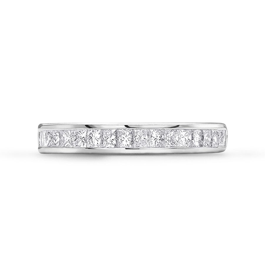 Heming's Gloucester design is a more contemporary style half eternity ring, channel set with princess cut diamonds, combined weight 0.35-0.65ct dependent on finger size and bandwidth. Manufactured and hand finished in our London workshops, the contoured interior ensures lasting comfort and wearability. Available in widths of 2mm, 2.5mm or 3mm and your choice of precious metal. Full eternity versions of the Gloucester style, set with diamonds all around the finger, are also popular and available upon request.